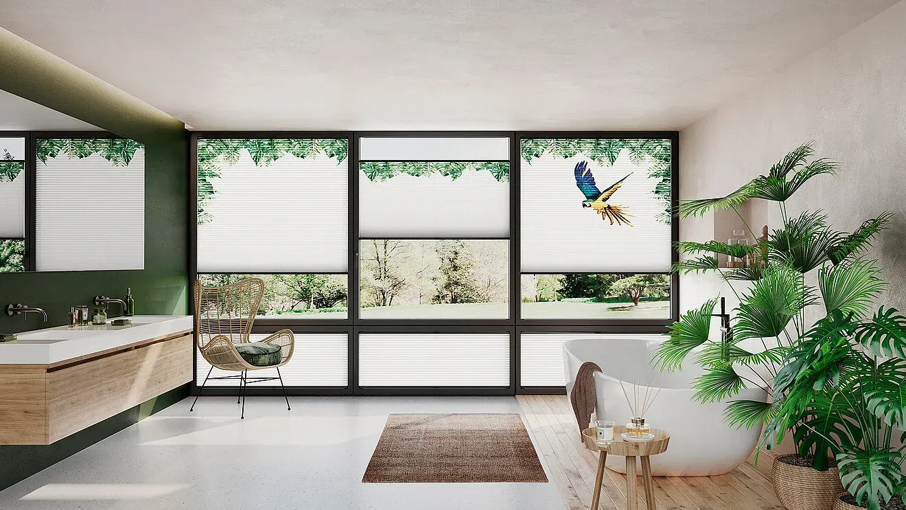 Mit blickdichten Stoffen schützen Sie Ihr Zuhause vor neugierigen Blicken und wahren Ihre Privatsphäre. Sorgen Sie für eine angenehme und sichere Atmosphäre, besonders in Räumen wie Schlafzimmer, Badezimmer oder Kinderzimmer, ohne die Räume ganz abzudunkeln. Mit dem Duo-Wabenplissee, welches aus zwei Stoffen besteht, können Sie beispielsweise zwei unterschiedliche Transparenzstufen kombinieren und damit noch gezielter Ihre Privatsphäre schützen und den Lichteinfall steuern.